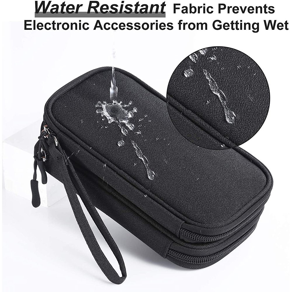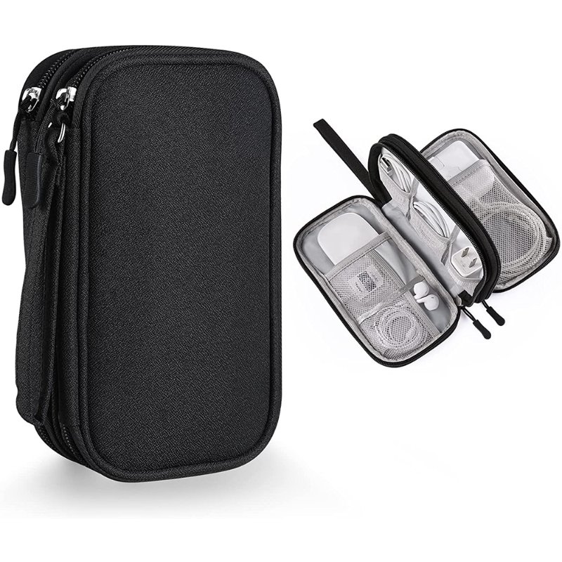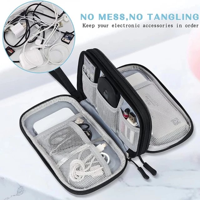 The electronics storage bag has 2 layers interior compartment with enough space to take in your cords, cables, USB drive, cellphone, charger, mouse, flash drive, and other accessories.